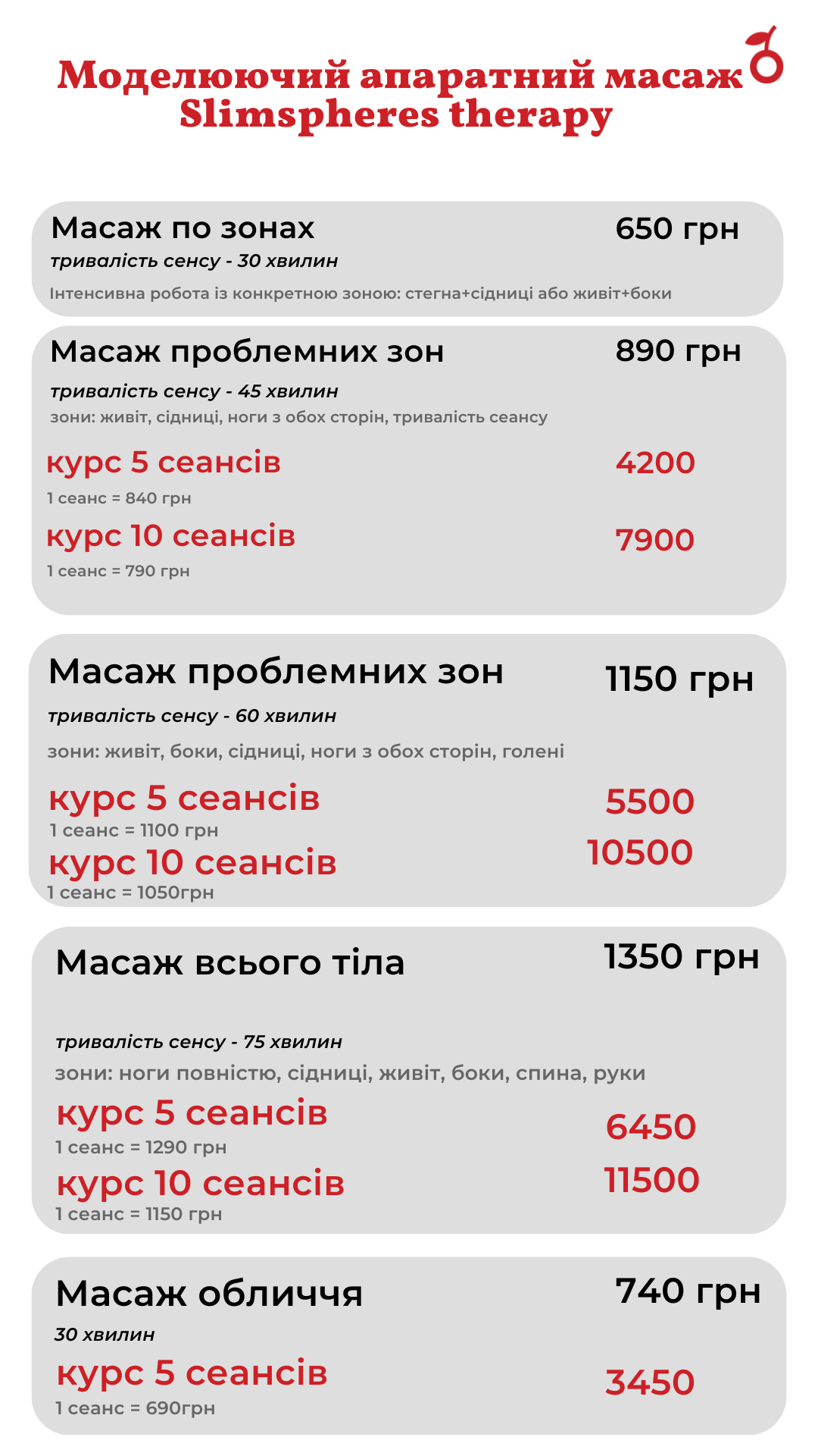 В Cosmetoligy Club ми робимо масаж на апараті Ендосфера 30, 45 та 60 хвилин. 30 та 45 хвилин – це масаж проблемних зон. А масаж 60 хвилин – це масаж всього тіла.